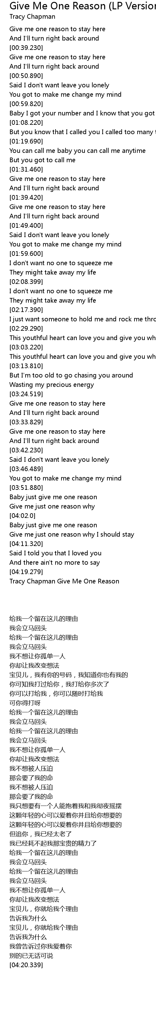 | [04:20.339] | Tracy Chapman Give Me One Reason |