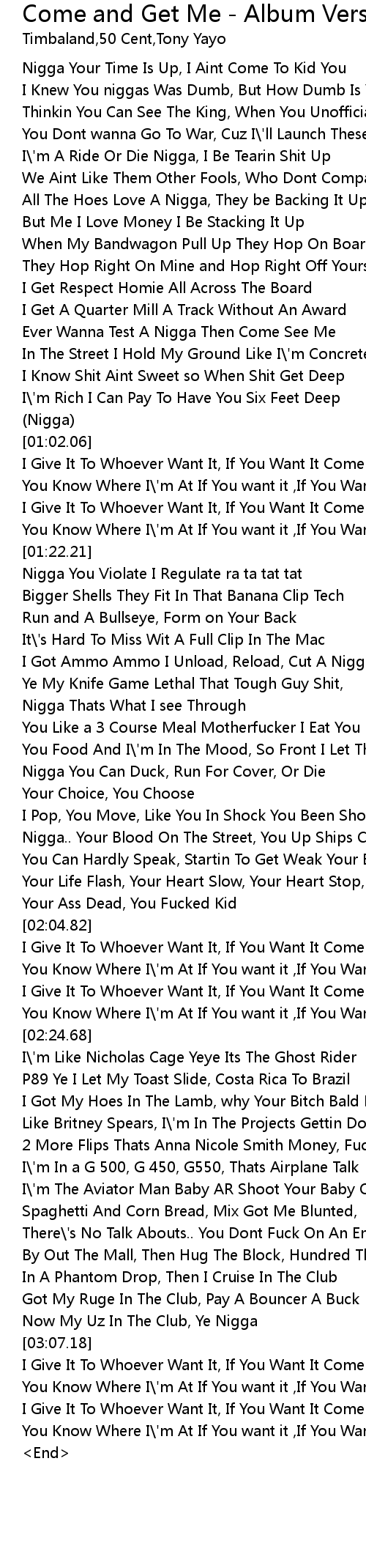| [02:10.33] | You Know Where I\'m At If You want it ,If You Want It Come Get Me |
