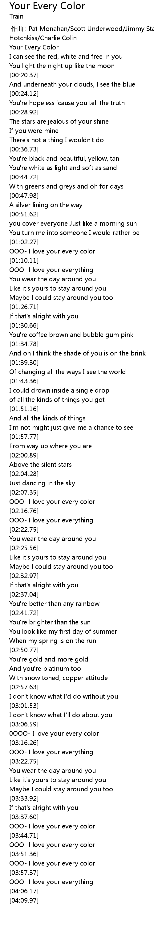 | [00:00.00] | zuo qu : Pat Monahan Scott Underwood Jimmy Stafford Rob Hotchkiss Charlie Colin |