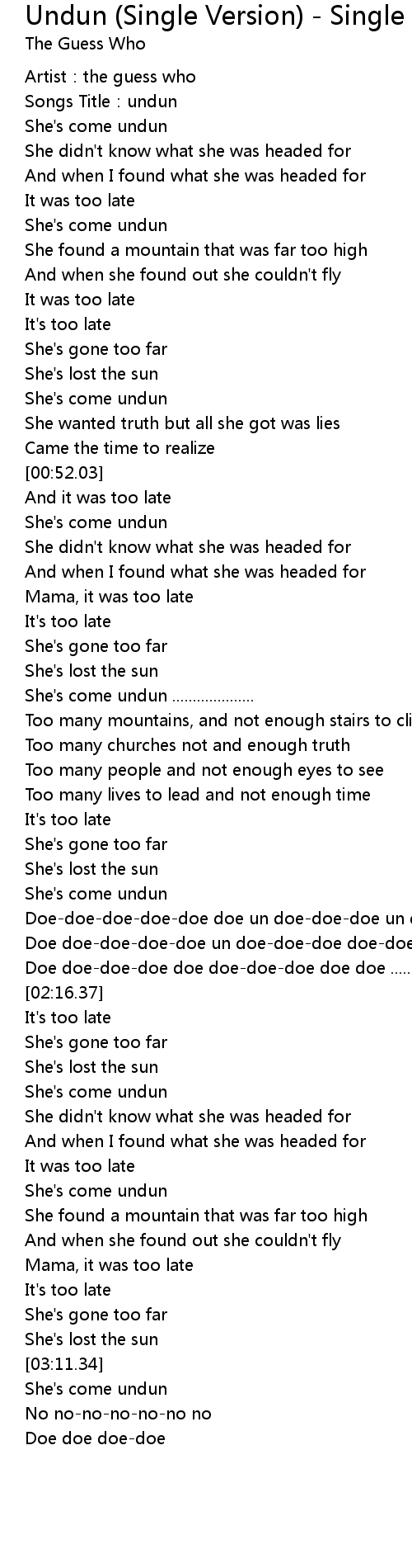 | [01:17.38] | She's come undun .................... |