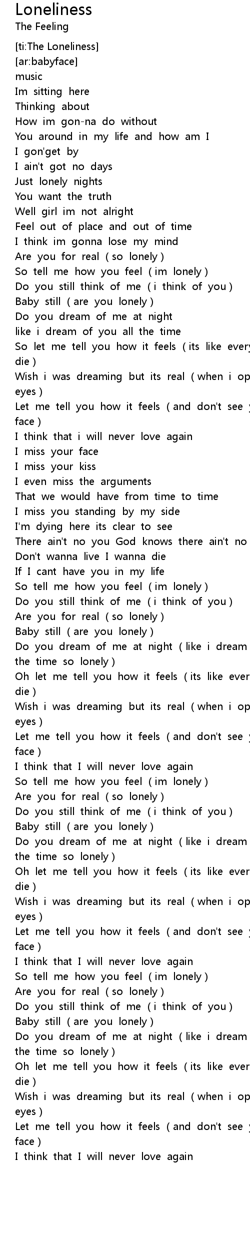 | [00:57.562] | So tell me how you feel (im lonely) |