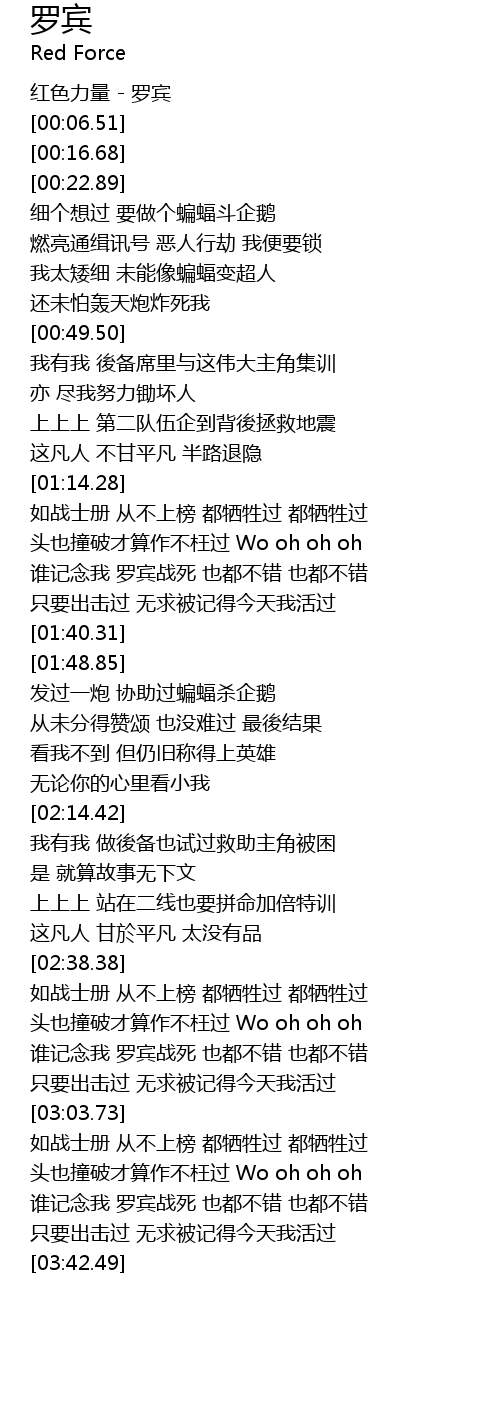 | [02:51.01] | shuí jì niàn wǒ luó bīn zhàn sǐ yě dōu bù cuò yě dōu bù cuò |