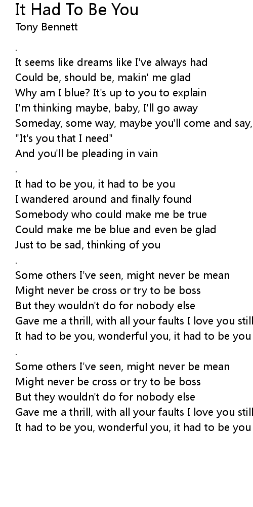 It had to be you, wonderful you, it had to be you |