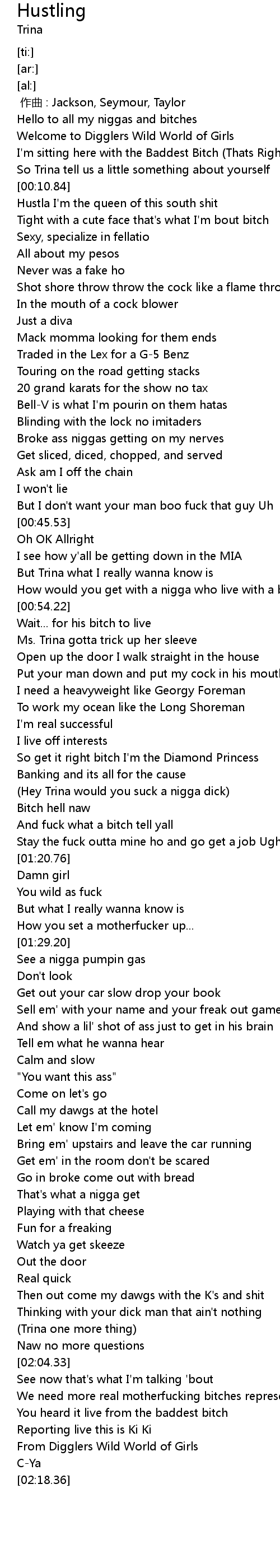 | [01:13.59] | Hey Trina would you suck a nigga dick |