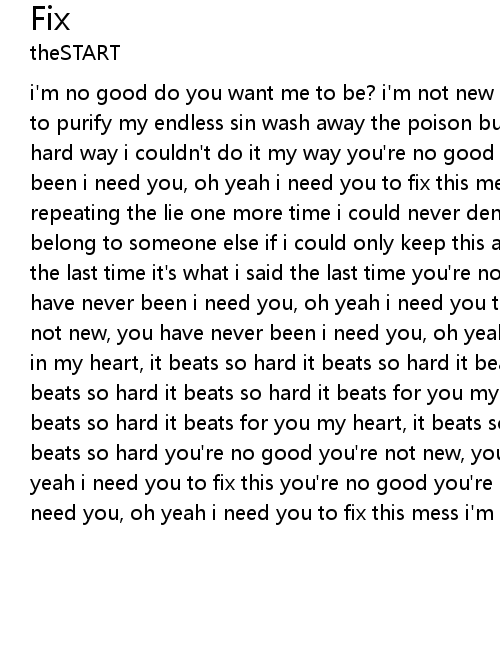 | i'm no good do you want me to be? i'm not new i have never been clean i need you to purify my endless sin wash away the poison buried in this skin i learned the hard way i couldn't do it my way you're no good you're not new, you have never been i need you, oh yeah i need you to fix this mess i'm in no control keep repeating the lie one more time i could never deny it seems as if these limbs belong to someone else if i could only keep this all inside myself this'll be the last time it's what i said the last time you're no good you're not new, you have never been i need you, oh yeah i need you to fix this you're no good you're not new, you have never been i need you, oh yeah i need you to fix this mess i'm in my heart, it beats so hard it beats so hard it beats for you my heart, it beats so hard it beats so hard it beats for you my heart, it beats so hard it beats so hard it beats for you my heart, it beats so hard it beats so hard it beats so hard you're no good you're not new, you have never been i need you, oh yeah i need you to fix this you're no good you're not new, you have never been i need you, oh yeah i need you to fix this mess i'm in |