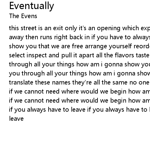 | this street is an exit only it's an opening which explains why this shit washes away then runs right back in if you have to always be leaving how am i gonna show you that we are free arrange yourself reorder again nothing has changed select inspect and pull it apart all the flavors taste plain if i can't find you through all your things how am i gonna show you that we are free if i can't find you through all your things how am i gonna show you that we are free trace translate these names they're all the same no one isn't only six billion monkeys if we cannot need where would we begin how am i gonna show you that we are free if we cannot need where would we begin how am i gonna show you that we are free if you always have to leave if you always have to leave if you always have to leave |