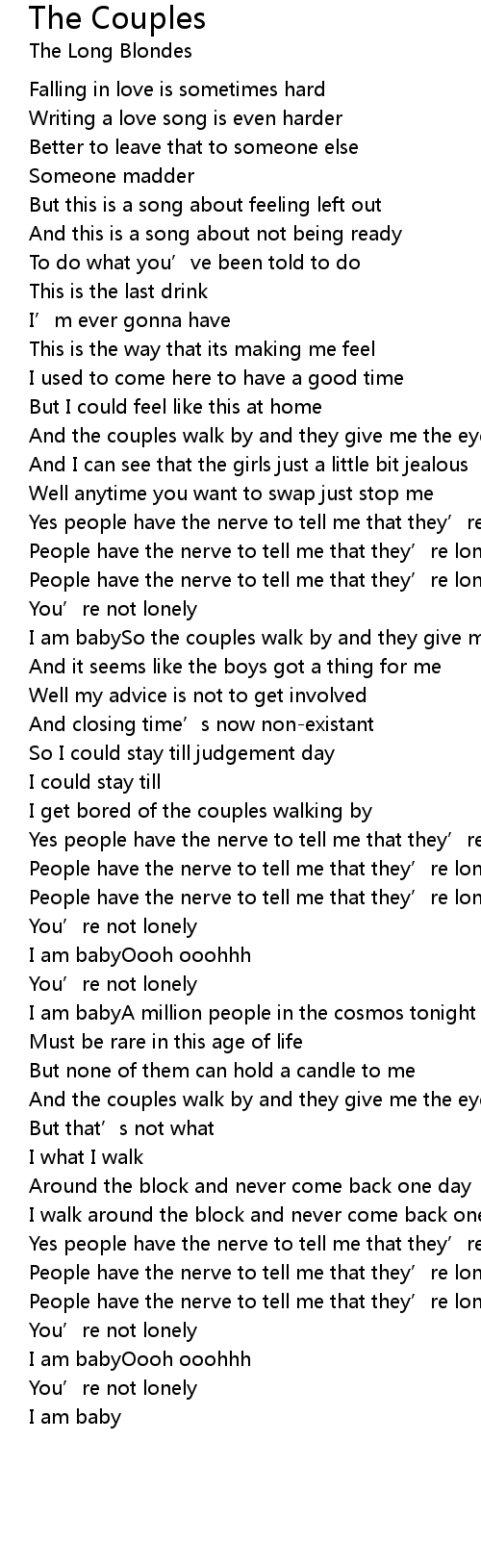 | And the couples walk by and they give me the eye | |