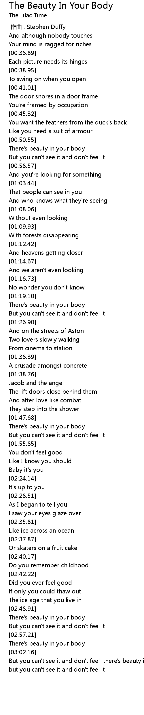 | [03:03.04] | But you can't see it and don't feel there's beauty in your body it but you can't see it and don't feel it |
