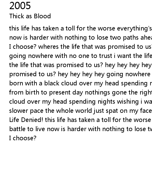 I choose? wheres the life that was promised to us? still cant accept defeat going nowhere with no one to trust i want the life that was taken from me wheres the life that was promised to us? hey hey hey hey wheres the life that was promised to us? hey hey hey hey going nowhere with no one to trust no one! i was born with a black cloud over my head spending nights wishing i was dead no one! from birth to present day nothings gone the right way i was born with a black cloud over my head spending nights wishing i was dead things are moving in a slower pace the whole world just spat on my face