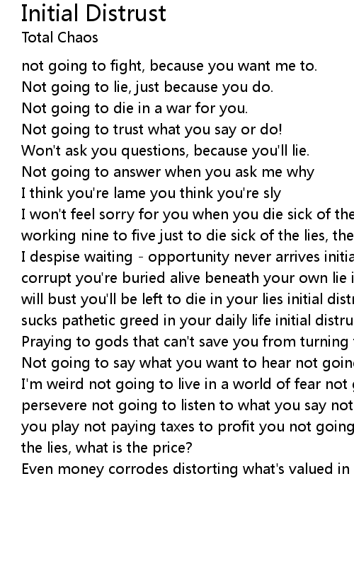 I despise waiting - opportunity never arrives initial distrust - the system's corrupt you're buried alive beneath your own lie initial distrust - the system will bust you'll be left to die in your lies initial distrust - a system that sucks pathetic greed in your daily life initial distrust - civilize us? |