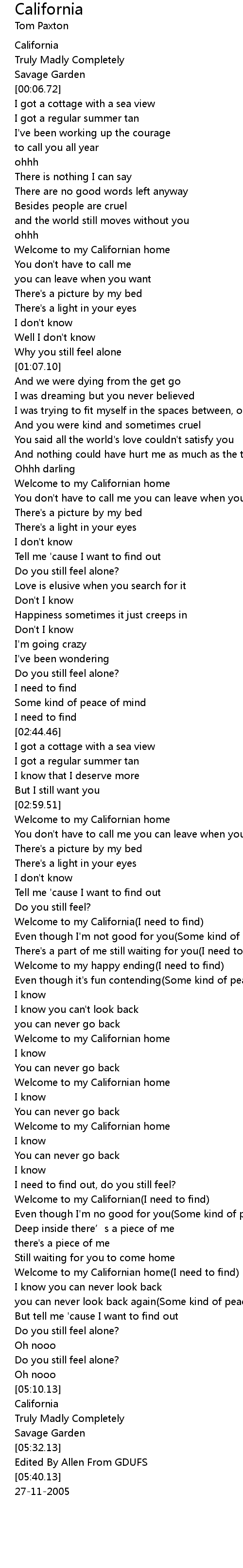 | [04:29.37] | Welcome to my Californian(I need to find) |