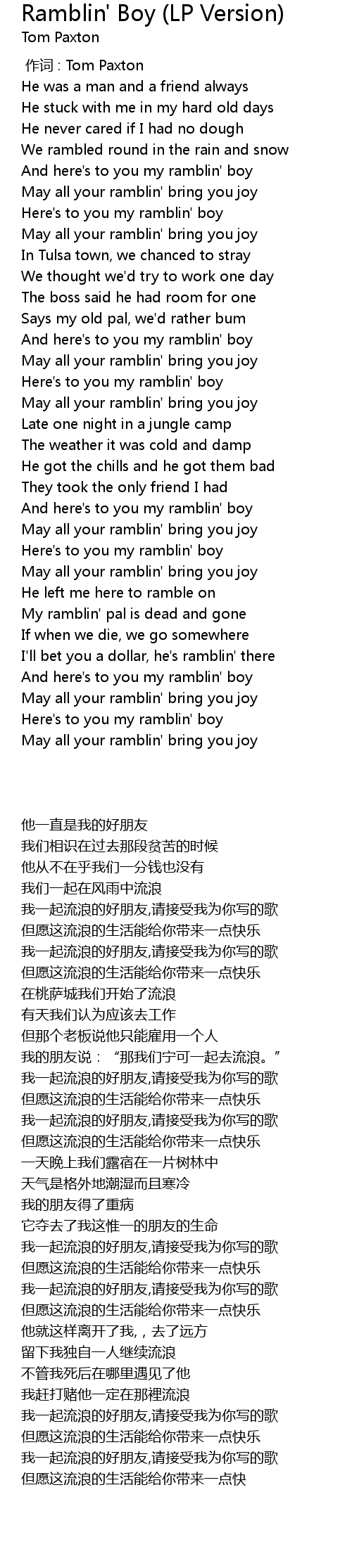 | [00:36.49] | And here' s to you my ramblin' boy |