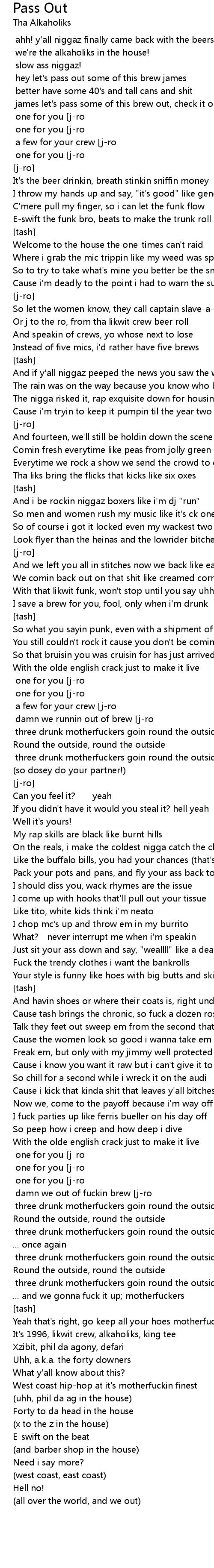 | [tash] damn we out of fuckin brew [j-ro] then fuck it, then we through | |