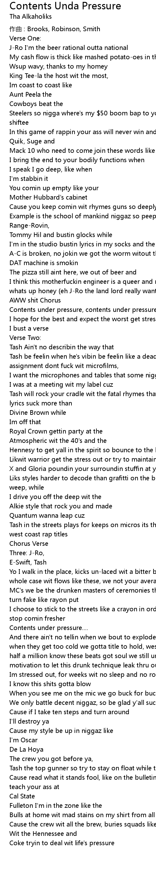 | And there ain' t no tellin when we bout to explode like tall cans in the freezer when they get too cold we gotta title to hold, west coast ghetto gold more than half a million know these beats got soul we still under pressure, thats my motivation to let this drunk technique leak thru out the nation | |