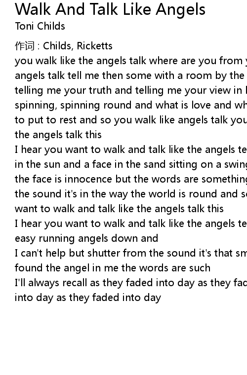 | I hear you want to walk and talk like the angels tell me then dear with a smile in the sun and a face in the sand sitting on a swing unfolding bits of string the face is innocence but the words are something more it's in the voice it's in the sound it's in the way the world is round and so we walk like angels talk you want to walk and talk like the angels talk this | |
