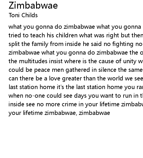 what you gonna do zimbabwae what you gonna do zimbabwae zimbabwae is a man who tried to teach his children what was right but then there came a time when war split the family from inside he said no fighting no more what you gonna do zimbabwae what you gonna do zimbabwae the old man sits and shakes his head while the multitudes insist where is the cause of unity with just one thought there could be peace men gathered in silence the same can there be some peace on earth can there be a love greater than the world we see greater than us all it's the last station home it's the last station home you ran your heart in those days when no-one could see days you want to run in the wind you want to go back inside see no more crime in your lifetime zimbabwae, zimbabwae no more crime in your lifetime zimbabwae, zimbabwae |