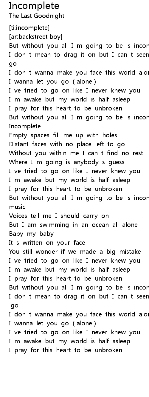 | [00:03.773] | But without you all I m going to be is incomplete |