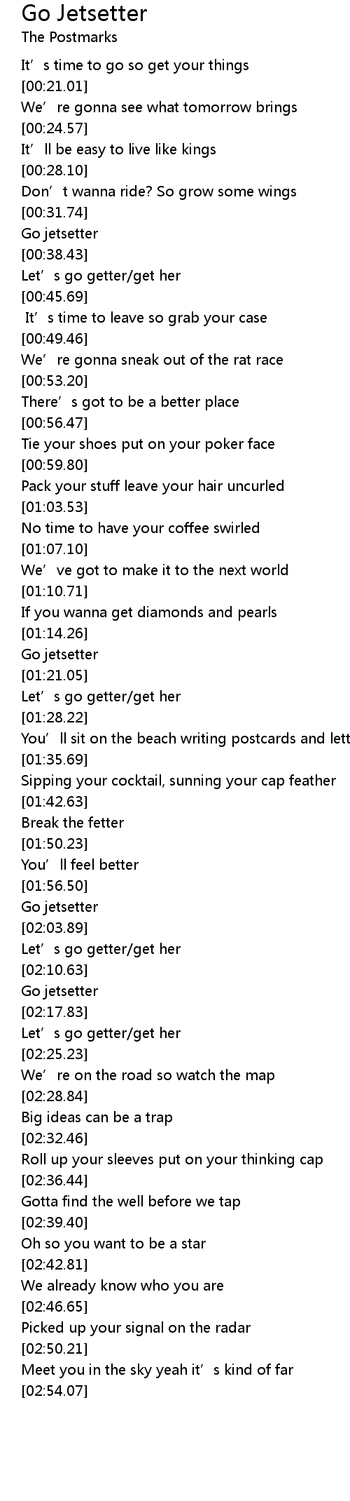 | [01:28.90] | You’ll sit on the beach writing postcards and letters |