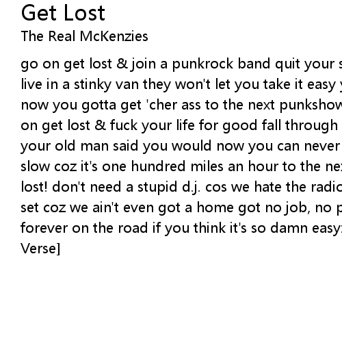 go on get lost & join a punkrock band quit your school, give up your job and live in a stinky van they won't let you take it easy you don't wanna get it slow now you gotta get 'cher ass to the next punkshow so... ya! go on! get lost! go on get lost & fuck your life for good fall through the cracks of society like your old man said you would now you can never take it easy never ever get it slow coz it's one hundred miles an hour to the next punkshow so ya...go on! get lost! don't need a stupid d.j. cos we hate the radio & we don't own a fukkin' tv set coz we ain't even got a home got no job, no pets, no family, coz we're forever on the road if you think it's so damn easy: just get lost! [Repeat 2nd Verse]