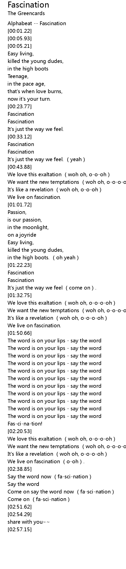 | [02:46.14] | Come on say the word now fascination |