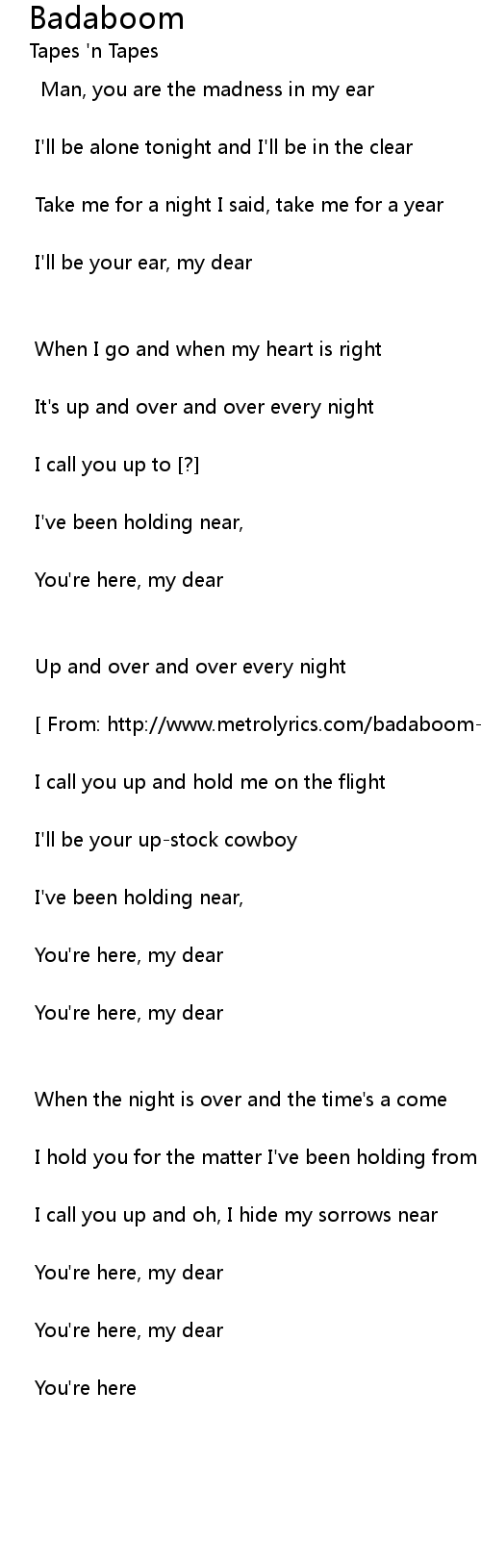 [ From: http://www.metrolyrics.com/badaboom-lyrics-tapes-n-tapes.html ] |