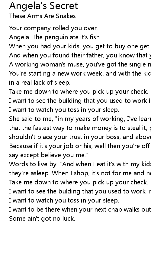 She said to me, "in my years of working, I've learned a few things. And it's that the fastest way to make money is to steal it, plus it is tax-free. You shouldn't place your trust in your boss, and above all, fuck all loyalty. Because if it's your job or his, well then you're off to the pigs. What can i say except believe you me." |