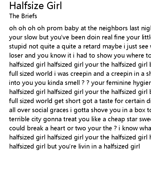 oh oh oh oh prom baby at the neighbors last night i think you smoke a simulator your slow but you've been doin real fine your little twit he will agree not stupid not quite a quite a retard maybe i just see what you want me too you're a loser and you know it i had to show you where to pee halfsized girl your the halfsized girl halfsized girl your the halfsized girl but you're living in a full sized world i was creepin and a creepin in a shadows i could care if i run into you you kinda smell ? ? your feminine hygien halfsized girl your the halfsized girl halfsized girl your the halfsized girl but you're living in a full sized world get short got a taste for certain diviant behaviors you piss all over social graces i gotta shove you in a box to take you with me across a terrible city gonna treat you like a cheap star sweetheart your pretty face could break a heart or two your the ? i know what ? ? halfsized girl your the halfsized girl halfsized girl your the halfsized girl halfsized girl your the halfsized girl but you're livin in a halfsized girl |
