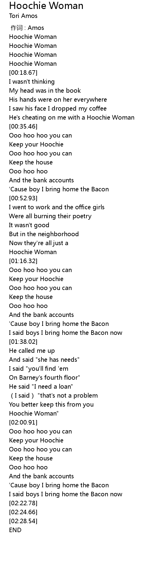 | [00:31.86] | He's cheating on me with a Hoochie Woman |