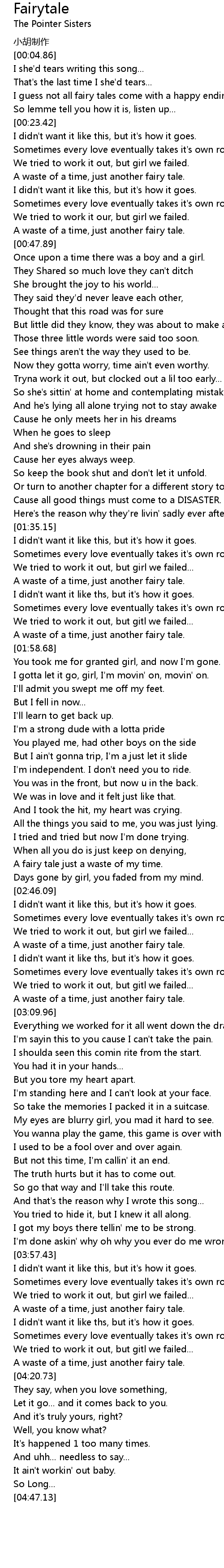 | [04:18.28] | A waste of a time, just another fairy tale. |