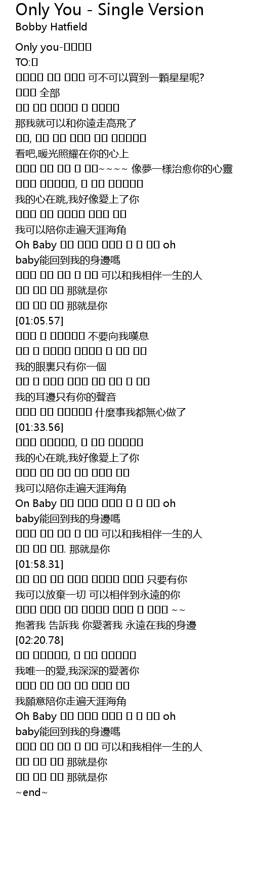 | [01:45.07] | On Baby oh baby neng hui dao wo de shen bian ma |