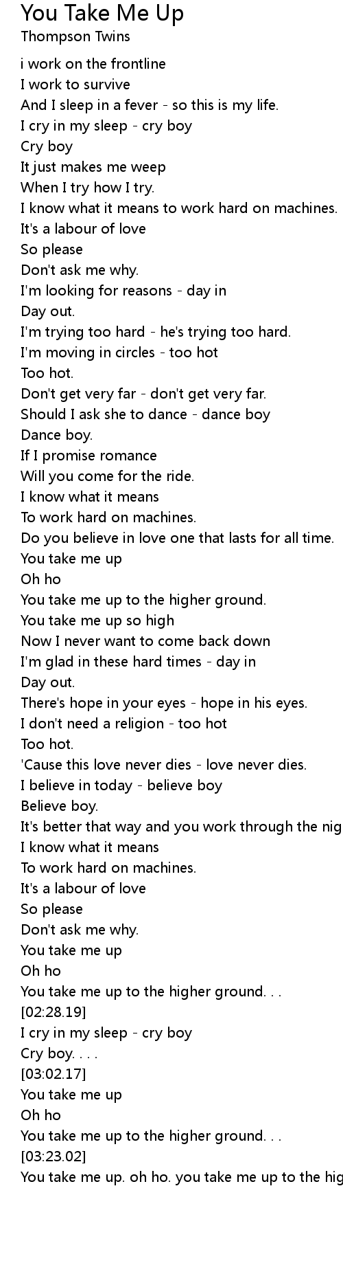 You take me up. oh ho. you take me up to the higher ground. . . |