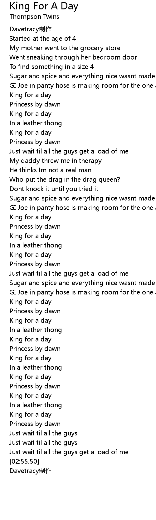 | [00:26.50] | GI Joe in panty hose is making room for the one and only |