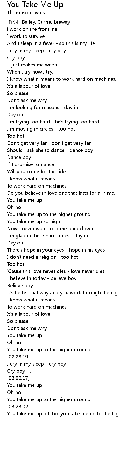 | [03:32.43] | You take me up. oh ho. you take me up to the higher ground. . . |