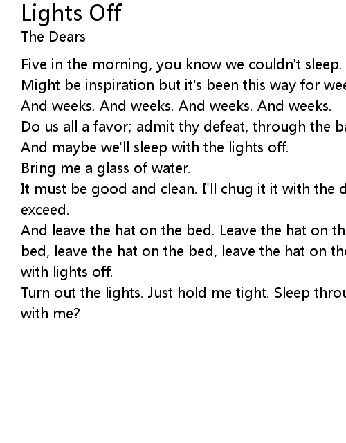 | And leave the hat on the bed. Leave the hat on the bed, leave the hat on the bed, leave the hat on the bed, leave the hat on the bed. And maybe we'll sleep with lights off. | |