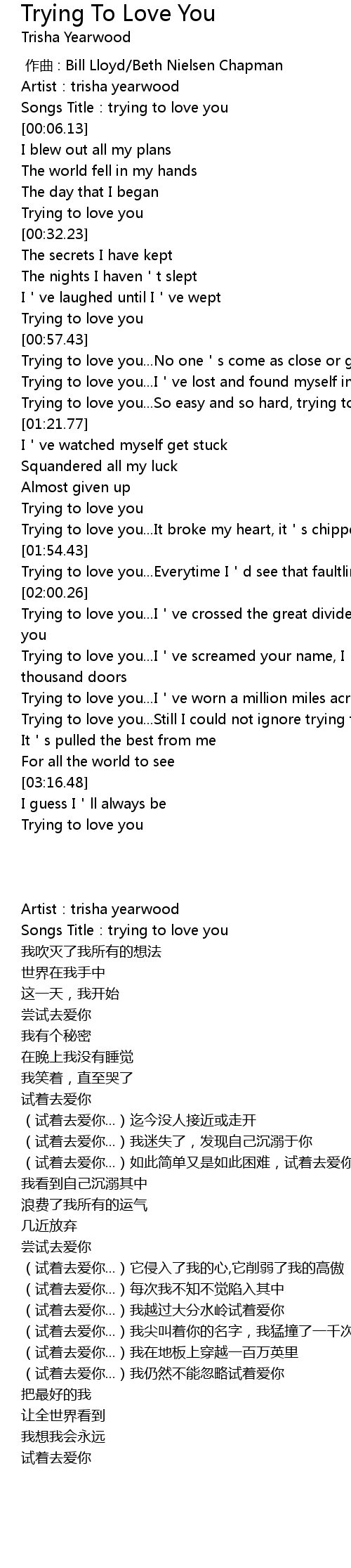 | [00:59.41] | Trying to love you... No one s come as close or gone so far |