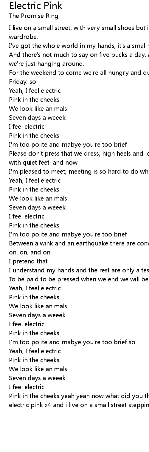Pink in the cheeks yeah yeah now what did you think that i would be feeling electric pink x4 and i live on a small street stepping out with quiet feet |