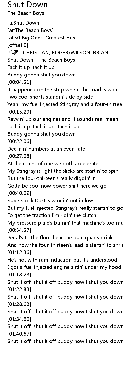 | [01:37.15] | Shut it off shut it off buddy now I shut you down |
