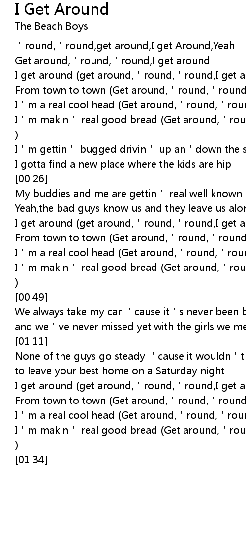 | [00:01] | 'round,'round,get around,I get Around,Yeah |