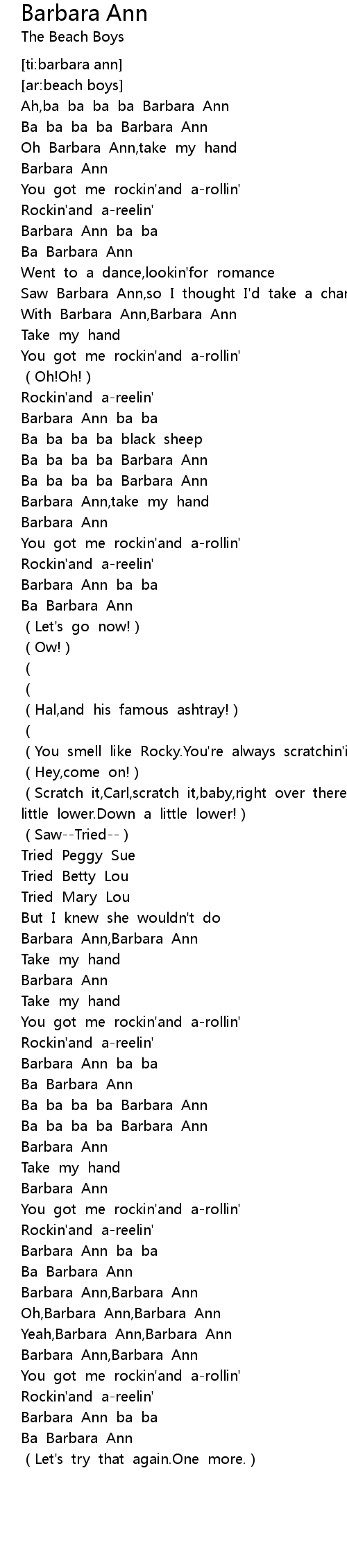 | [02:05.406] | Yeah, Barbara Ann, Barbara Ann |