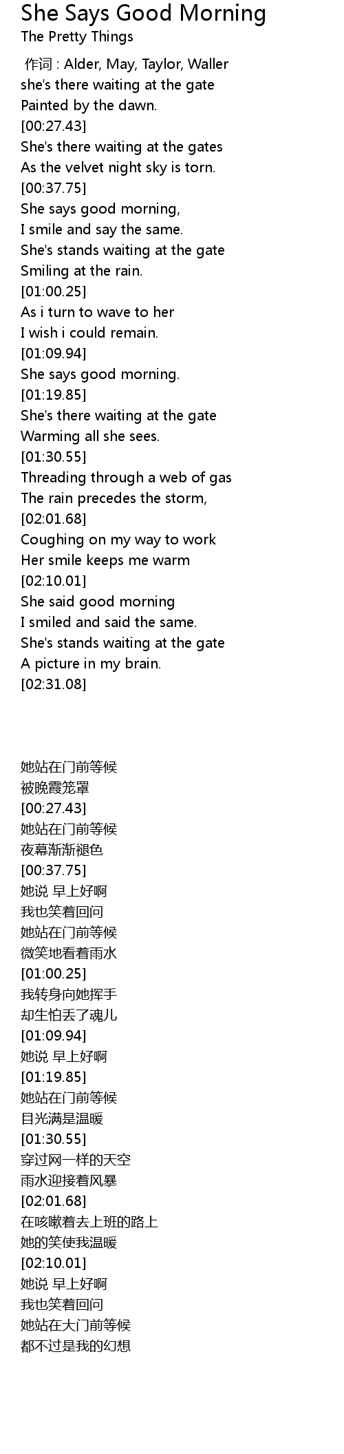 | [00:43.48] | She says good morning, |