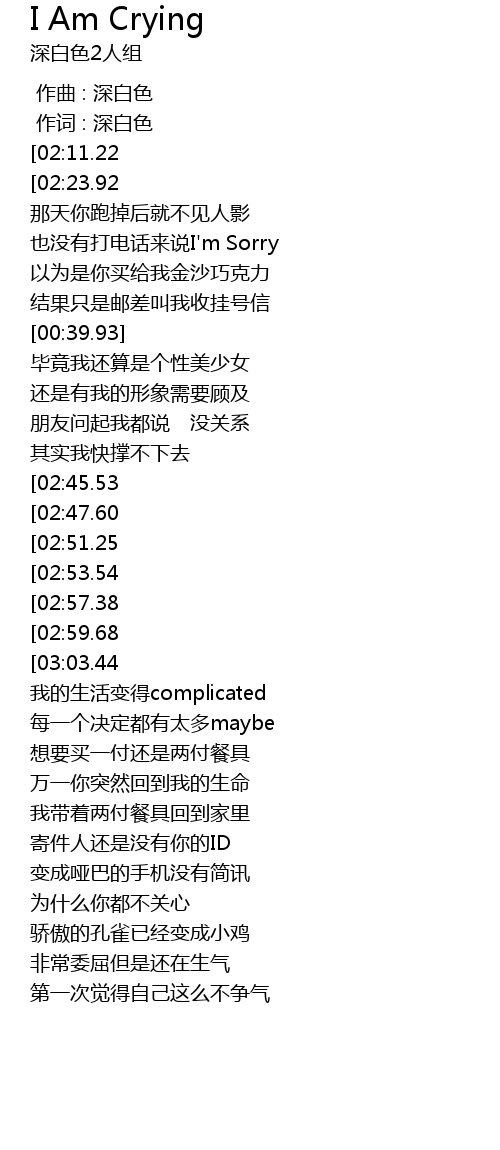 | [03:27.99][03:03.44][02:02.18][01:13.25] | I'm crying 我好想你 |