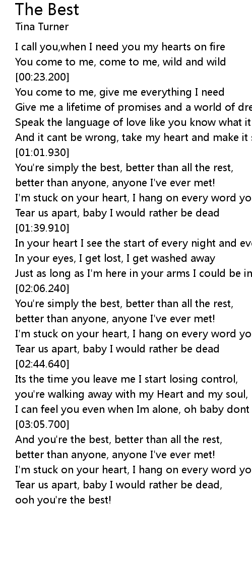 | [01:03.750] | You' re simply the best, better than all the rest, |