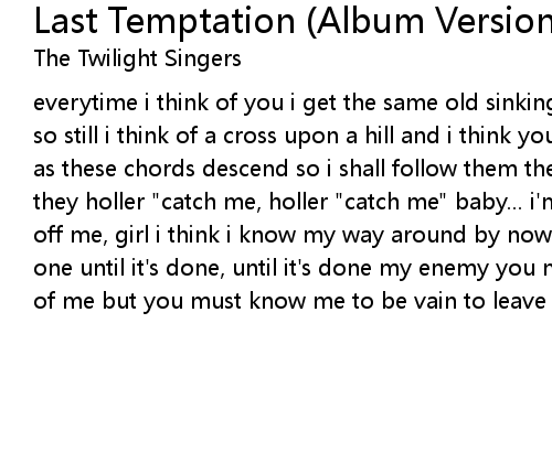 everytime i think of you i get the same old sinking feeling i think of a garden, so still i think of a cross upon a hill and i think you know what i'm sayin' so as these chords descend so i shall follow them they holler "catch me if you can" they holler "catch me, holler "catch me" baby... i'm goin' down get yer hands up off me, girl i think i know my way around by now they come to the party one by one until it's done, until it's done my enemy you must think you have the best of me but you must know me to be vain to leave this undone would be such a shame |