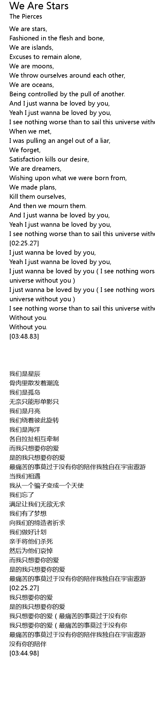 | [03:23.45] | I just wanna be loved by you I see nothing worse than to sail this universe without you |