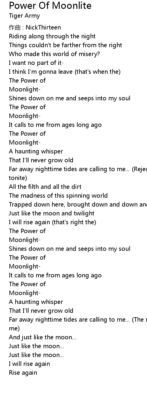 | Far away nighttime tides are calling to me... The moon' s purity Your power unto me | |