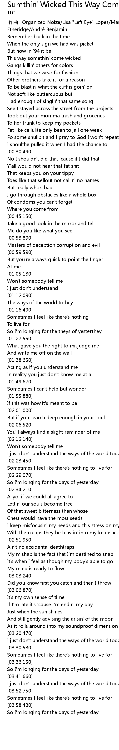 | [00:00.00] | zuò qǔ : Organized Noize Lisa " Left Eye" Lopes Marqueze Etheridge André Benjamin |