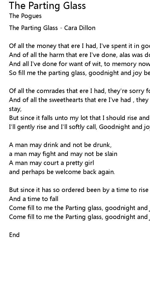 Come fill to me the Parting glass, goodnight and joy be with you all. |