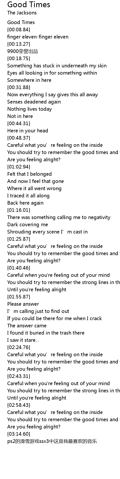 | [03:08.83] | Are you feeling alright? |