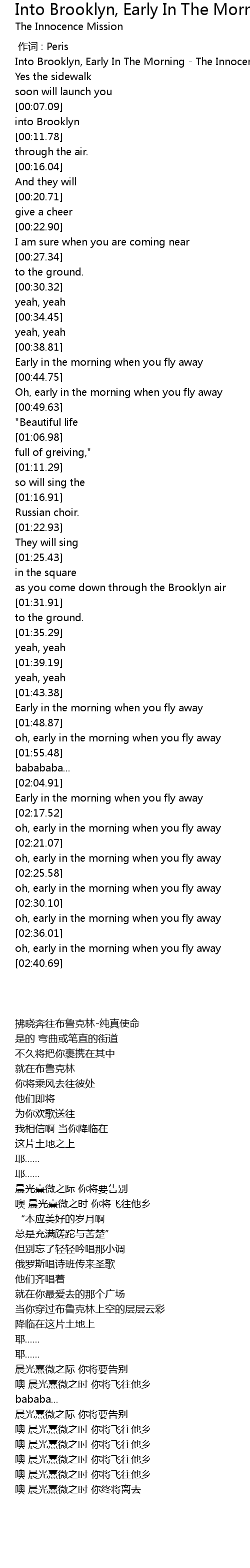 | [00:00.05] | Into Brooklyn, Early In The Morning The Innocence Mission |