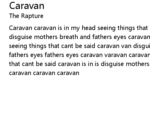 | Caravan caravan is in my head seeing things that cant be said caravan is in disguise mothers breath and fathers eyes caravan caravan caravan is in my head seeing things that cant be said caravan van disguise mothers breath fathers eyes fathers eyes fathers eyes caravan varavan caravan is in my hat seeing things that cant be said caravan is in is disguise mothers breath and fathers eyes caravan caravan caravan |